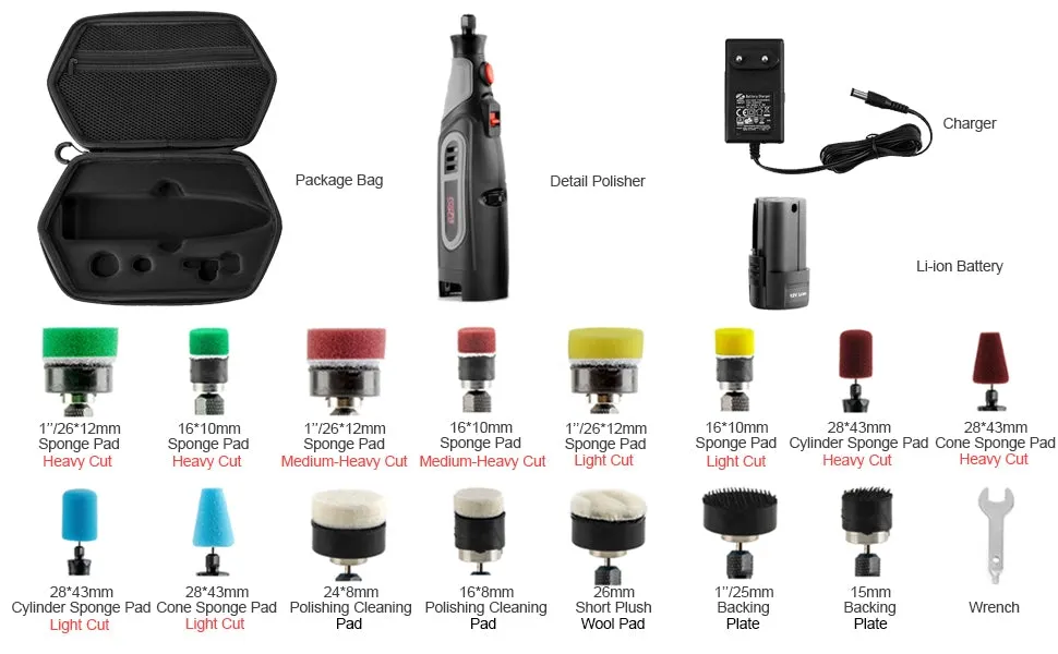 جلا دهنده جزئیات برای خرده فروشان حرفه ای طراحی شده است.  با لوازم جانبی مختلف، می توان از آن در مناطقی مانند چراغ های جلو اتومبیل، چراغ های مه شکن، چراغ های ترمز، دستگیره درها، نشان ها، سطوح شیشه ای خش دار، پانل های کنسول داخلی یا مناطق کوچک استفاده کرد.  علاوه بر این، می توانید از آن برای انجام سایر کارهای پولیش نیز استفاده کنید!